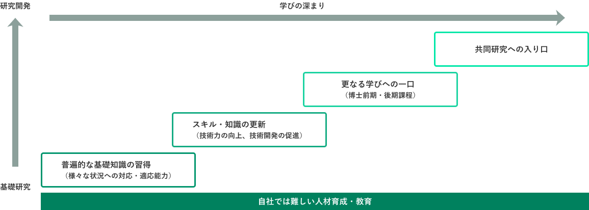 - 人材育成を目的としたリカレント教育プログラムを、大学と地域産業群との協働で実施します。