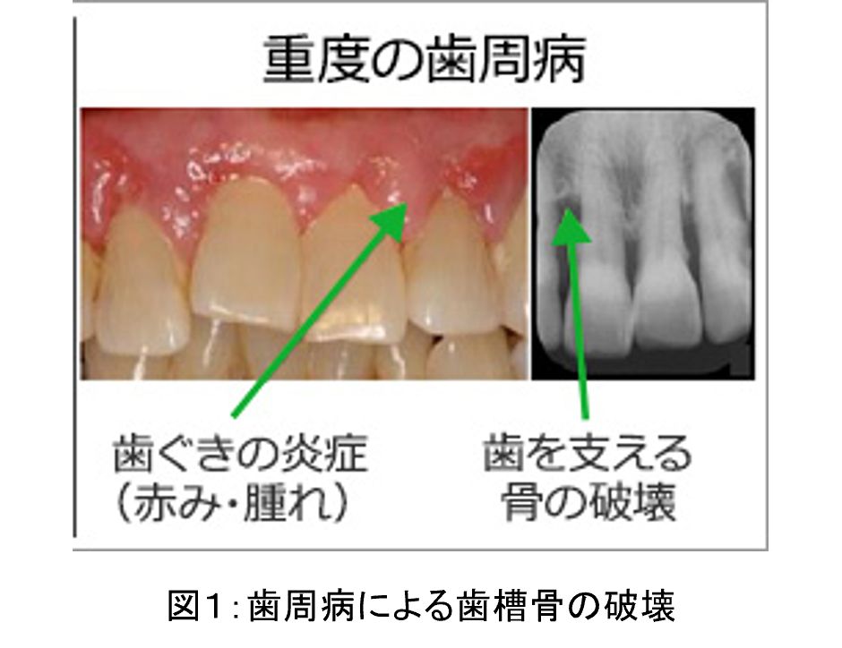 その有病率の高さから国民病と呼ばれる「歯周病」は、歯ぐきの炎症と歯を支える骨(歯槽骨)の破壊により、歯を失う原因となります(図1)。