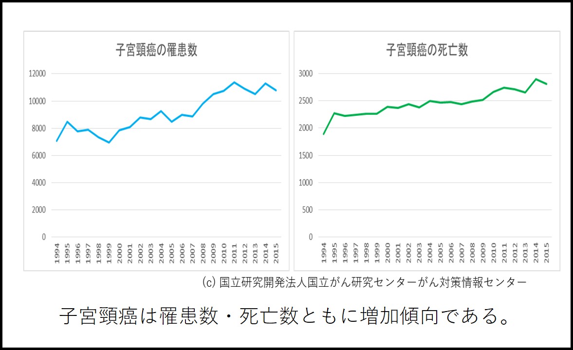 近年、45歳以下の女性において罹患数の多い子宮頸癌ですが、その80%程度は細胞診による癌の前駆病変の検出が可能な扁平上皮癌です。子宮がん検診を受けることで早期発見・早期治療(二次予防)が可能です。さらに、子宮頸癌の発症はヒトパピローマウイルス(HPV)の感染が主たる原因であることが解明され、ワクチン接種により一次予防も可能です。それにも拘らず死亡数は上昇傾向にあります。これは子宮がん検診受診率が低いことに加えて、腺癌の罹患数増加が一因であると考えられます。細胞診による子宮がん検診では腺癌前駆病変を検出し難いことに加えて、HPV感染と無関係な腺癌が存在することにより、子宮頸癌の予防的治療戦略が機能しないためと考えられます。