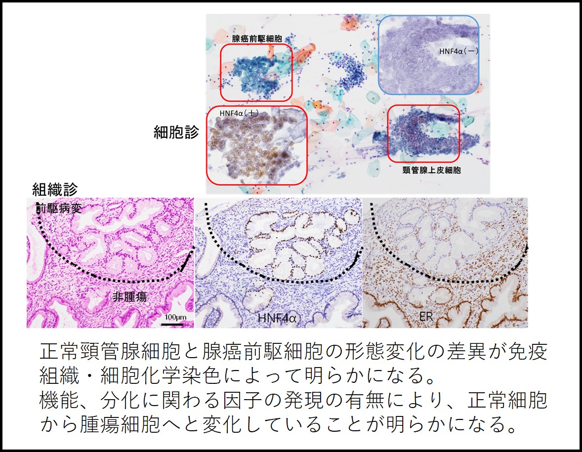 本研究室では、臨床病理組織・細胞検査検体の形態学的解析と併せて、細胞・組織の機能に関わる因子の発現タイミングを解析することで、癌化プロセスに転じた細胞をより早期に検出する方法を探索しています。この研究成果により子宮頸部腺癌前駆病変の早期発見と診断精度向上への効果が期待されるとともに、腺癌発癌機構の解明による治療戦略へ発展することも期待されます。