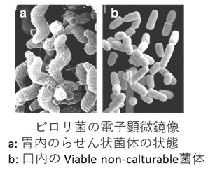 WHO(世界保健機関)は、ピロリ菌(図1)が胃がんの原因因子であると認定し、ピロリ菌除菌が胃がんの予防効果を高めると認め、各国ごとに戦略を立てるように勧告しています。ピロリ菌は胃の内部以外にも、口腔内からも高確率で検出されます。しかしながら、口腔ピロリ菌はDNAでしか検出法が確立しておらず、口腔内に存在するピロリ菌が胃の感染とどのように関係しているか、わかっていません。