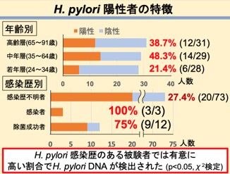 私たちは、日本における胃のピロリ菌感染が減少しつつあるにもかかわらず、若年層(24〜34歳)でも20%以上の人が口腔内にピロリ菌DNAを保有していることを明らかにしました。また、ピロリ菌に感染したことがある人は高い頻度で口腔ピロリ菌が検出されています。そこで私たちは、胃と口腔のピロリ菌のDNA相同性を解析し、関連性があるのかを研究しております。高い相同性があることが確認できれば、ピロリ菌の感染経路や供給路を示唆する重要なエビデンスを追加することが可能になると考えられます。