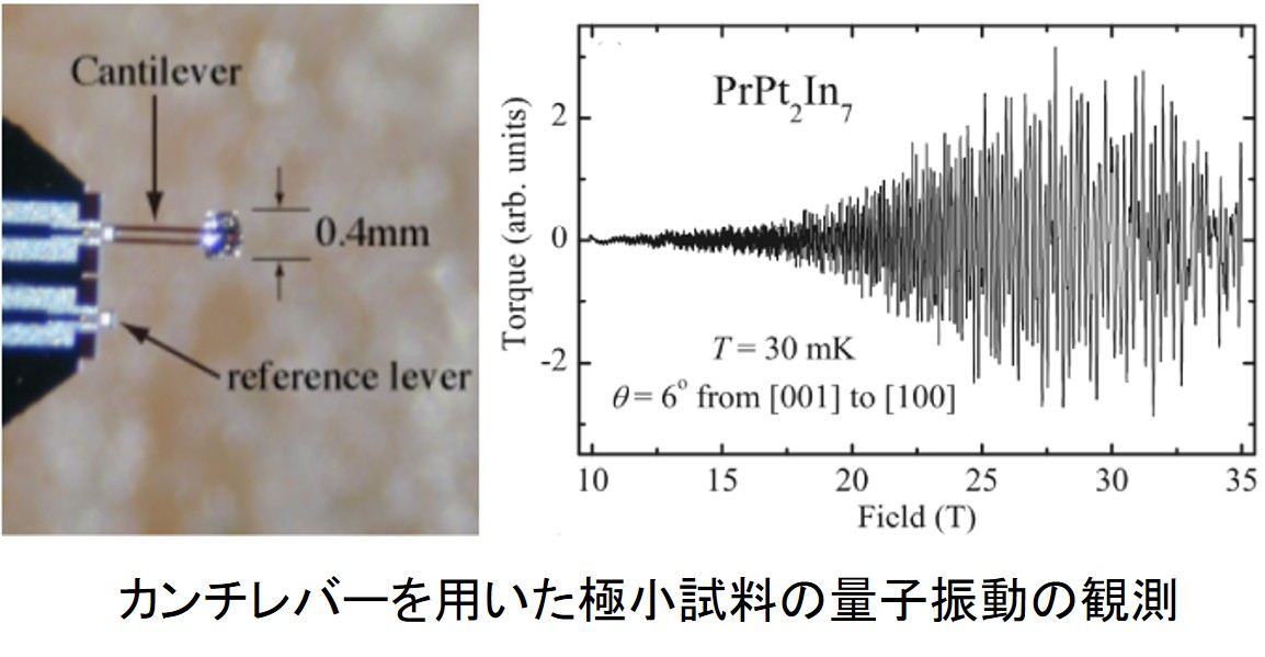 物質の性質は構成原子が持つ電子が担っています。物質中の電子状態を直接的に観測できるドハース-ファンアルフェン効果は、磁化の量子振動として検出されます。カンチレバーを用いれば、0.1mm程度の極小試料でも実験可能です。個々の物質が示す性質と電子状態を理解することで、より機能性を高めた物質開発が可能になります。