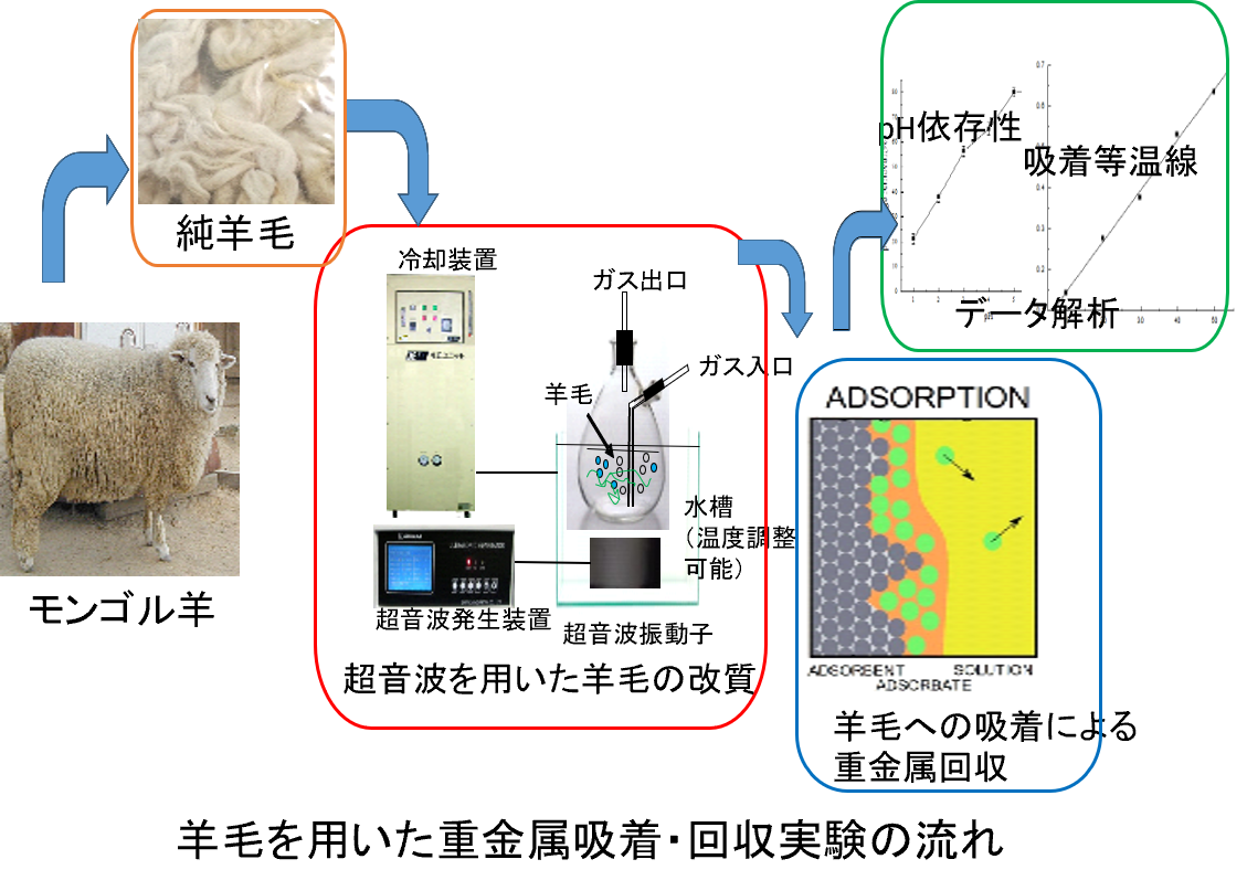 バイオマスとして、海藻および海藻由来のアルギン酸、アルギン酸ゲル、貝殻およびキチン・キトサン、木炭、植物などの他、モンゴル化学技術大学の共同研究により羊毛をベースとした吸着剤を作成し金属の除去・回収の研究を行っています。