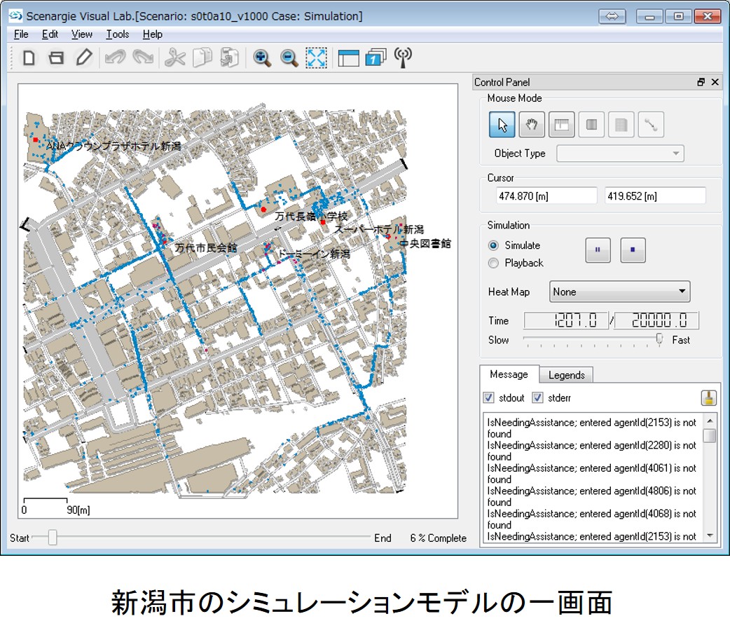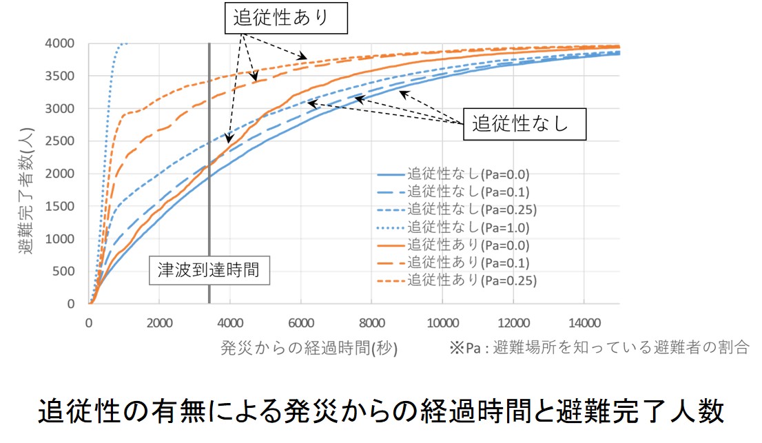 当研究室では、マルチエージェントシステム(MAS: Multi-Agent System)を用いて、避難者を模擬するエージェントに、心理学や社会学の観点から明らかにされてきた心理要因を導入し、現実に近い形でのシナリオを実装したモデルで避難効率の検証を行っています。右図に示すのは、新潟市のGIS(Geographic information System)データを入力した場合のシミュレーションモデルの一画面で、心理要因の一つである追従性の有無による発災からの経過時間と避難完了人数を示しています。