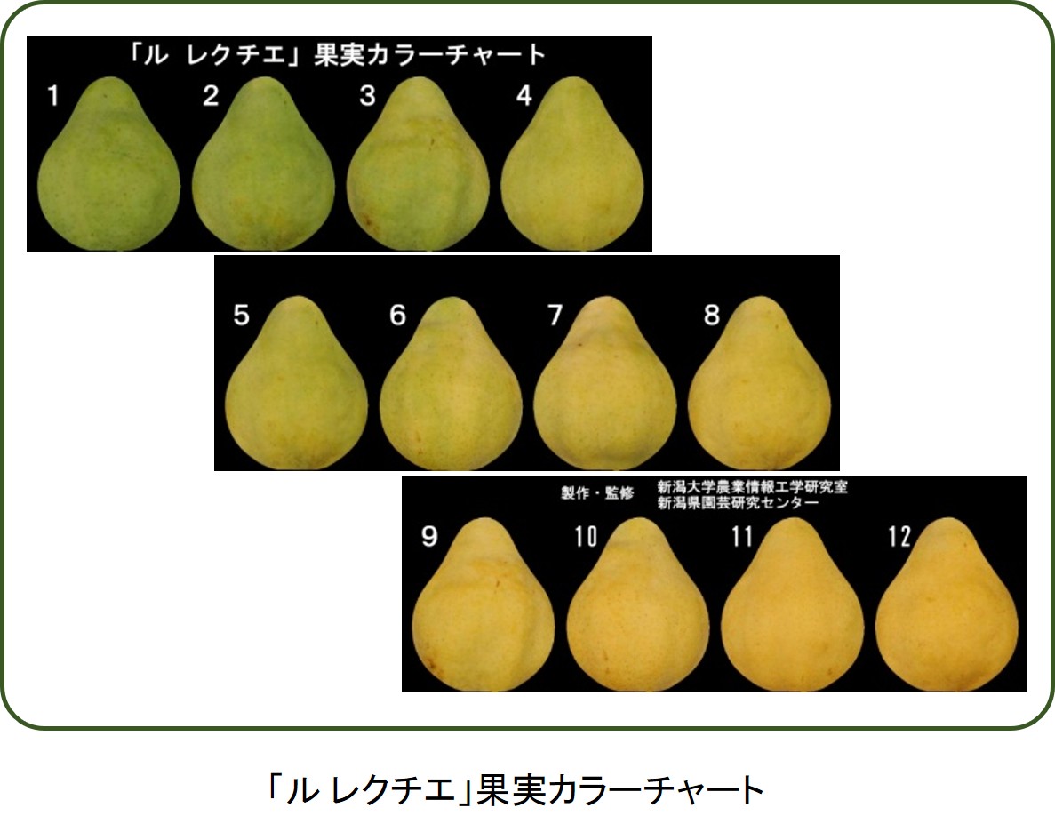 この果実カラーチャートは定量的に扱うことが難しい、果実の追熟進度の評価基準となっています。また、近赤外分光、中赤外分光を用いて、成熟過程での果実の内部成分の変化を解析することで、糖・有機酸成分の組成、含量の変化と成熟との関係、成熟後の品質評価などに関する研究も行っています。