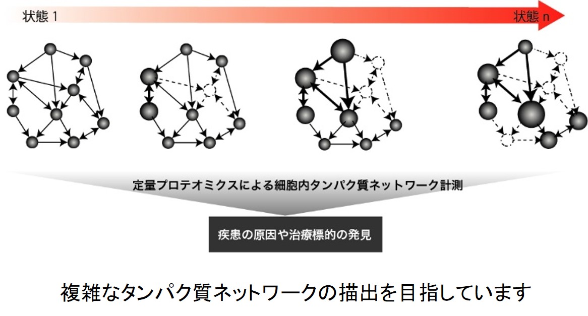 生体内で起きている多種多様な生化学反応は主にタンパク質によって行われています。タンパク質の配列はゲノム情報から容易に推定することができますが、その量、構造、活性など実際のタンパク質の生体内での機能を知るために必要な情報はゲノム情報から直接読み取ることはできません。また、多くのタンパク質は他のタンパク質と相互作用してネットワークを形成して機能することから、単独タンパク質の機能解析だけでは、生命システムを十分に理解することは困難です。