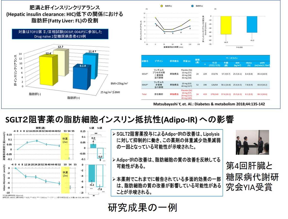 例えば、その一例として、糖尿病治療薬の治験データ併合解析があります。SGLT2(sodium glucose co-transporter 2)阻害薬は、血糖低下作用のみならず、体重低下作用や心血管イベント抑制作用などの作用を持ち、世界的に注目されている薬剤である一方、そのメカニズムはまだ十分に解明されていません。これまで我々は、本プロジェクトから糖尿病病態生理の新たな側面や本薬剤の新たな効果等について報告しました(右図)。