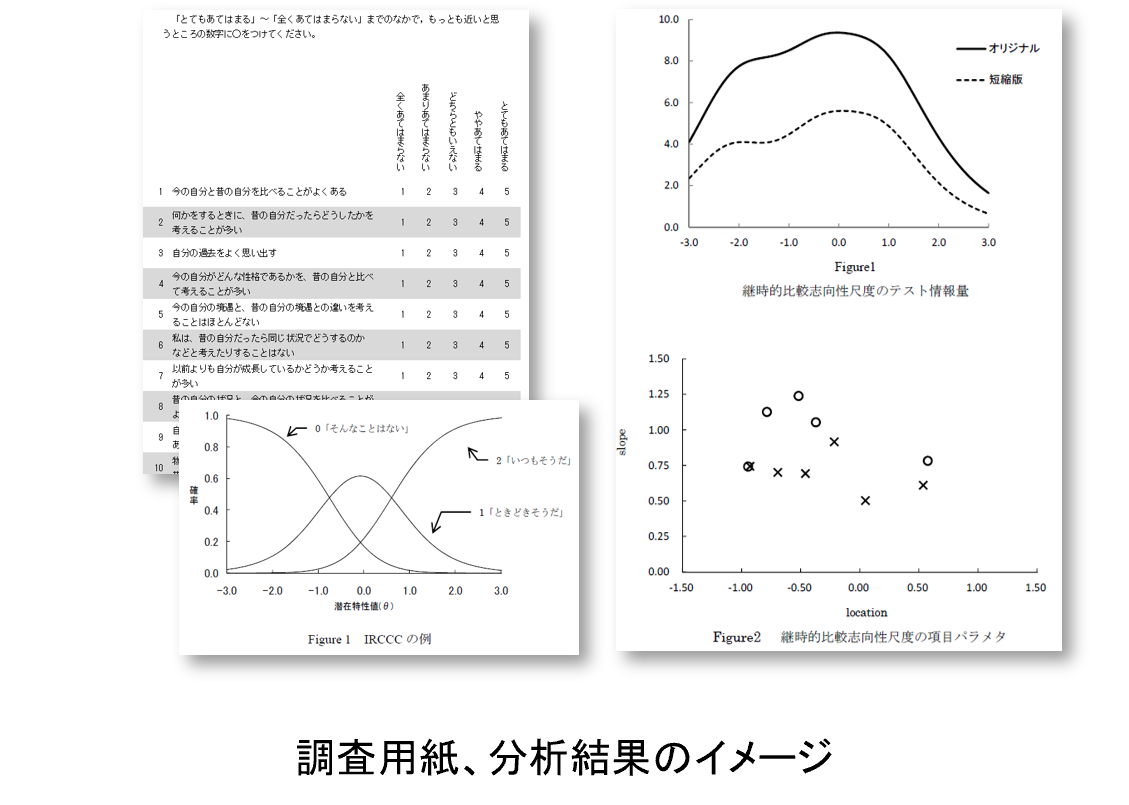 心理尺度(アンケート)の作成、活用に関する研究を行っています。アンケート調査は、住民の意識やニーズを尋ねる調査から、児童・生徒の学習状況を調べる調査、イベント参加者に満足度を聞く調査など、さまざまな場面で多く活用されていると思います。一見簡単に実施できるように見える反面、実際に適切なアンケートを作成するには、多くの工夫や試行錯誤が必要になることもあります。そこで、そのような調査の計画から、具体的な質問項目の作成、そしてデータの分析も含めて、アンケート調査の実施に役立つような知見を得ることを目指しています。具体的には、古典的テスト理論や項目反応理論(IRT)と呼ばれる理論等をもとに検討します。性格や精神的健康の測定などがメインですが、近年は県内の観光動機やニーズの測定など、地域の課題に係る意識を測ることにも関心を持って研究を進めています。