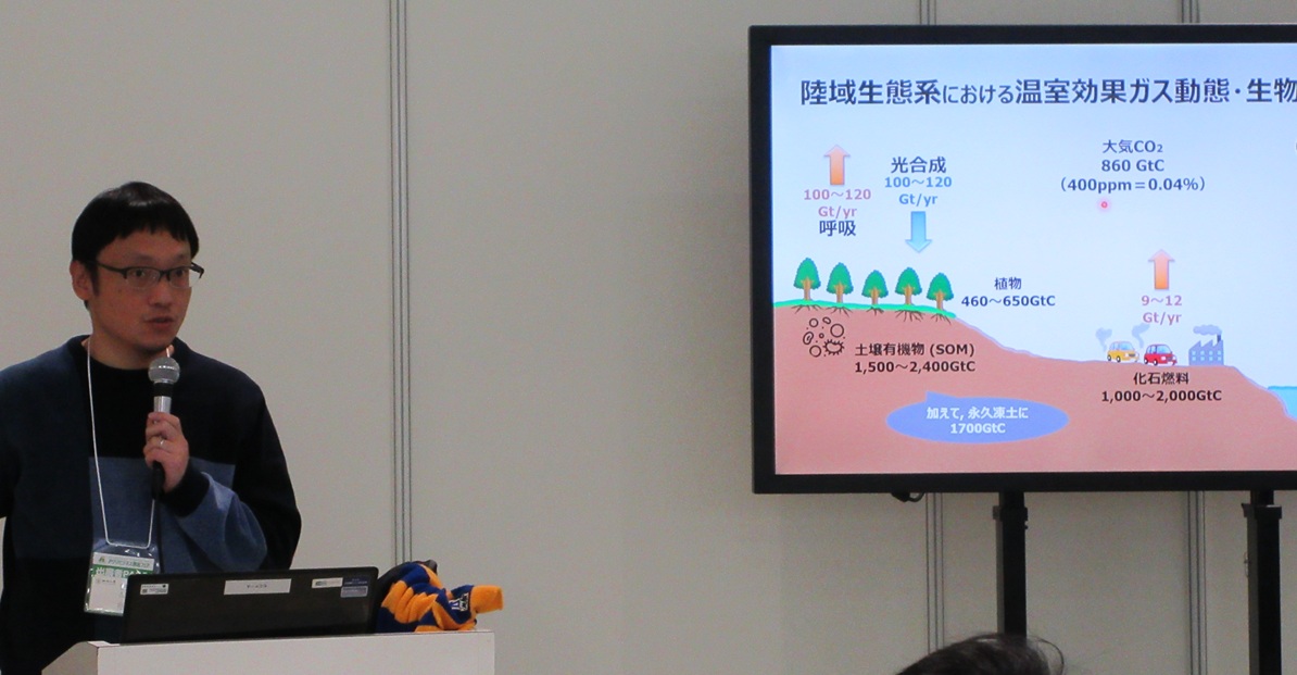人為起源排出の10倍規模超に相当する陸域生態系や土壌の温室効果ガス動態を解明する研究や関連技術開発について紹介しました。